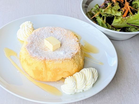 厚焼きパンケーキとサラダのセットです。 ※ドリンクはセット価格(+100円~)でお付けできます。
